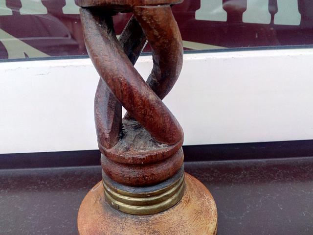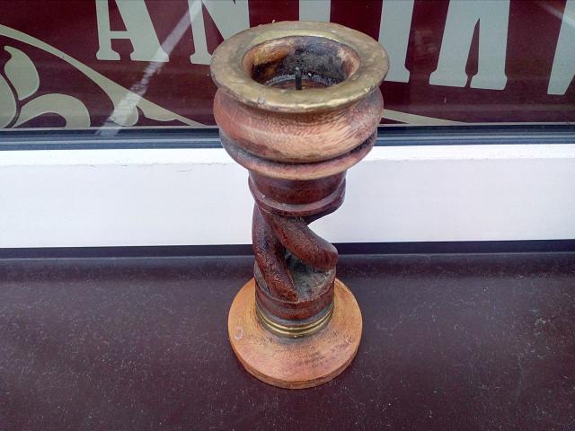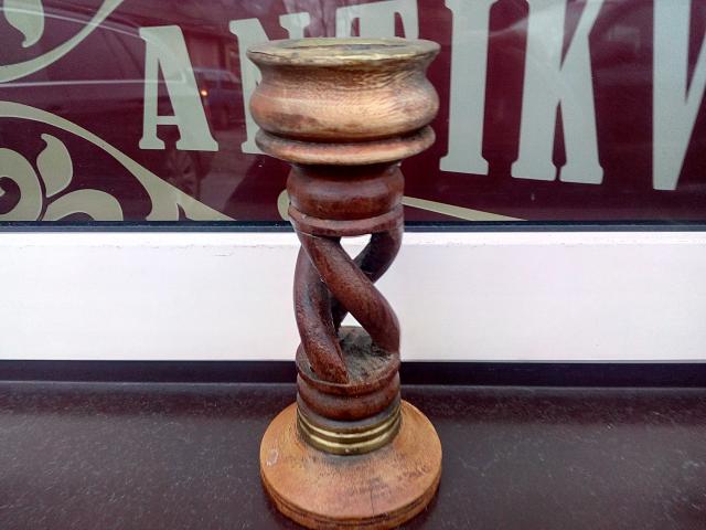 Medinė, stilinga žvakidukė, puošta žalvario skardele.