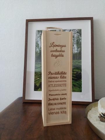 Vyno dėžutė su vestuviniais linkėjimais. Puiki dovana įvairioms progoms. Galima dėti vyną, šampaną ar skanios degtinės butelį. 11x11x36 cm Parduočiau ar mainyčiau į ką nors. Atsiimti Vilniuje arba galiu siųsti per paštomatą (+2eur)