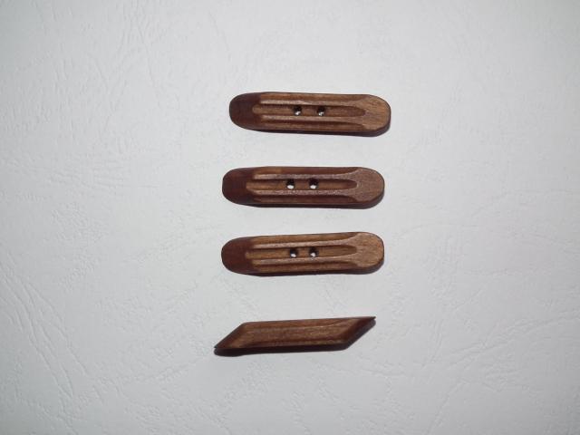 4 pailgos medinės sagos. Išmatavimai: ilgis 43 mm, plotis 10 mm Storis 6 mm