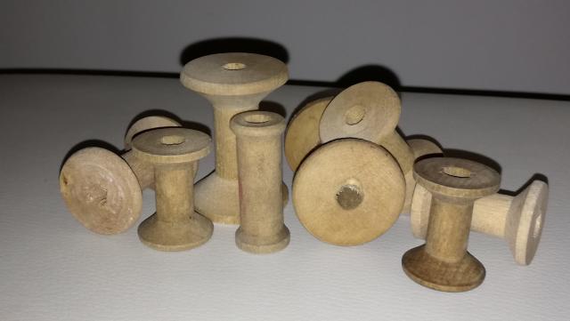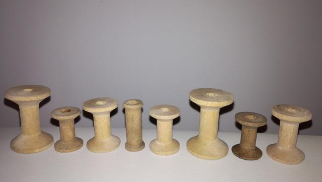 Įvairios medinės siūlų špūlės (8 vnt.), nuo H 3 cm iki H 4.6 cm.