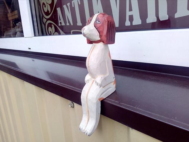 Dedasi ant lentynos krašto ir sėdi nukabinęs kojas. Aukštis 19,5 cm.