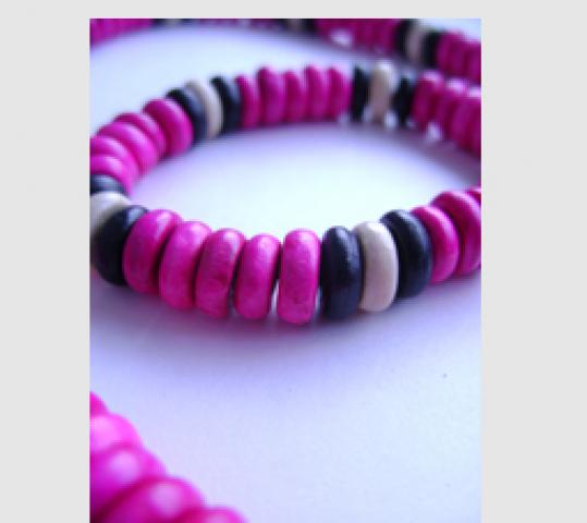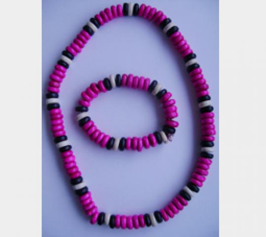 Komplekta sudaro apyranke ir karoliai ant kaklo. Ant fotkes nesimato gerai, taciau jie toki gan ryskus ruzavi. Nei karto nenesiojau, nes man prie nieko netiko.