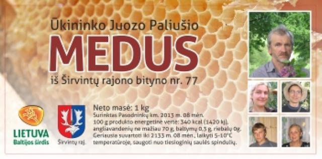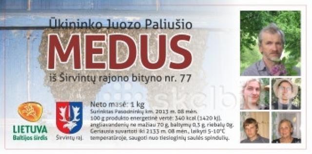 Pasodninkų kaimo žiedų. Yra ir mažesnių stiklainių. Spalva – ruda, nėra labai tamsus. Normalus medus – garantuoju kokybę. Kovai su varoze nenaudojam cheminiu preparatų. Surinktas rugpjūtį Juozo Paliušio ūkio keleto avilių bityne, Širvintų raj. PAPILDOMA INFORMACIJA Medus randasi Šeškinės gatvėje netoli poliklinikos, Vilniuje atvežu. Važinėju į darbą iš st. „Šeškinės poliklinika“ į „Žaliasis tiltas“. Galime išrašyti sąskaitą
