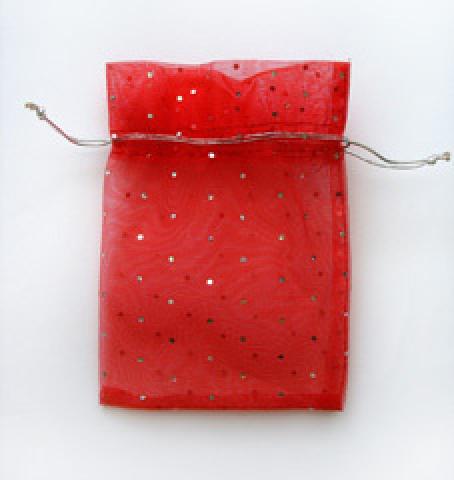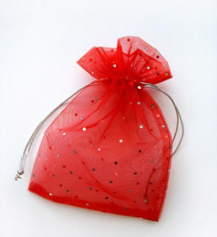 Mielas raudonas maiselis sidabriniais taskeliais ir sidabriniu raisteliu, sutraukiamas. Apie 15 cm aukscio