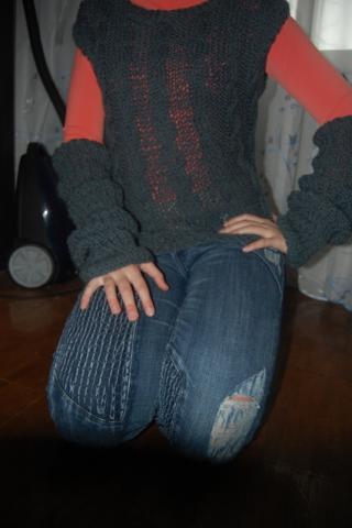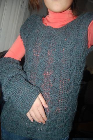 Tamsiai žalios spalvos, megzta liemenė su rankovėm. Dydis ~38.