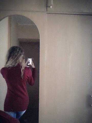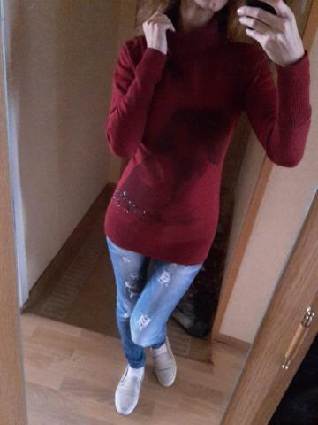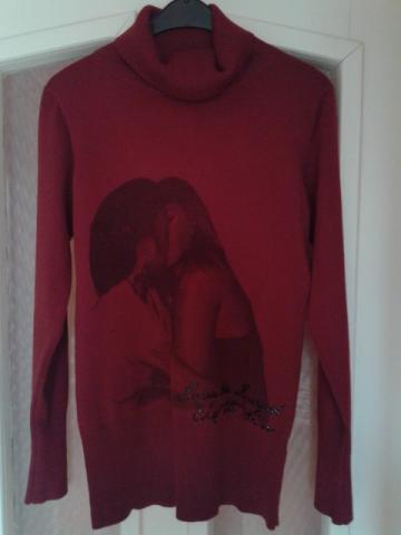 Tamsiai raudonos (panašu į bordo) spalvos megztinis aukštu kaklu. Ilgis 69 pečiai 39, rankovės 64, krūtinės apimtis 45x2. Sudėtis: 15% cachemir, 15%viskose, 30% acrylic, 40% poliester.