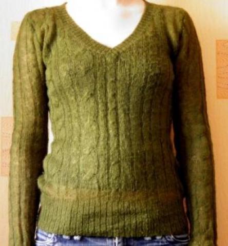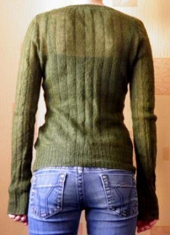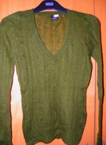 Tamsiai žalios spalvos plonas megztukas. Ties rankove yra maža skylutė (galima susitvarkyti).