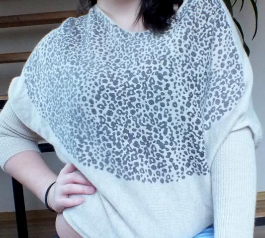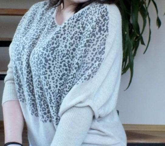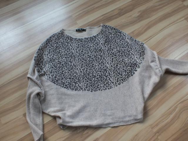 Šviesus,plačiai krentantis megztinis.Priekyje tigrinė dekoracija.