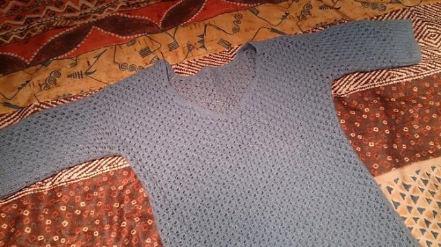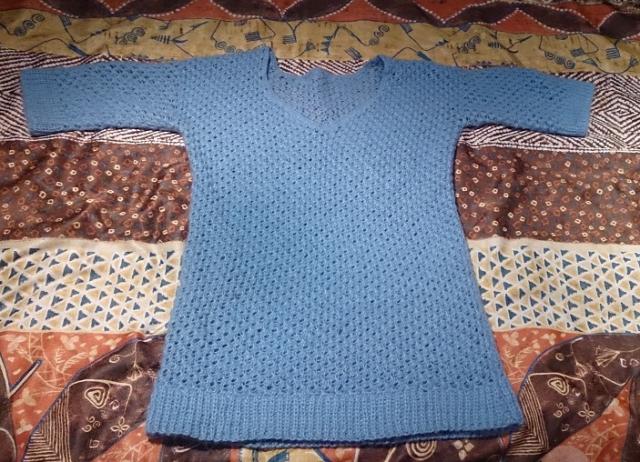 egzta tunika su rankovėmis, kiauras mezginio raštas. Tiktų dydžiui M/L. Matmenys: *ilgis ~68 cm; *nuo peties iki peties ~ 38 cm; *nuo pažasties iki pažasties ~ 34 cm; *rankovių ilgis ~ 24 cm.