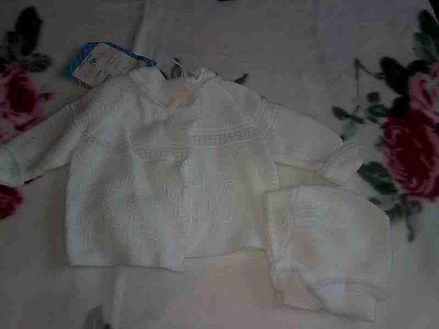 Megztukas ir kepuryte naujagimiui, baltos spalvos, naujas, seniai pirktas. Nedėvėtas.