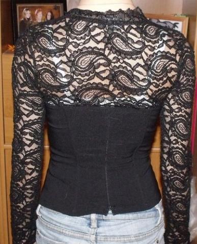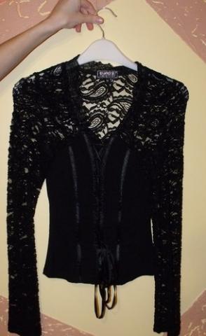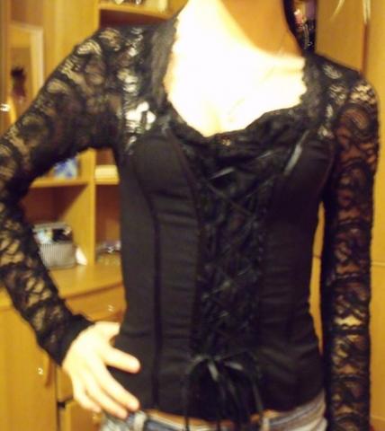 Vieną kartą tik nešiotas megztukas- korsažas. Per priekį viskas suvežiama raištukais, gale- užtrauktukas. Šonuose vielutės,kad palaikytų formą. Rankovėse-tinklelis. Dydis manyčiau,kad būtų XS.