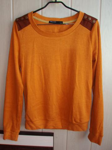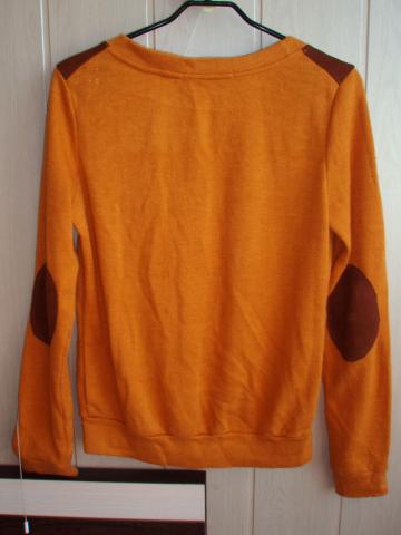 Gražus garstyčių spalvos, moteriškas megztinis su lopais ant alkūnių.