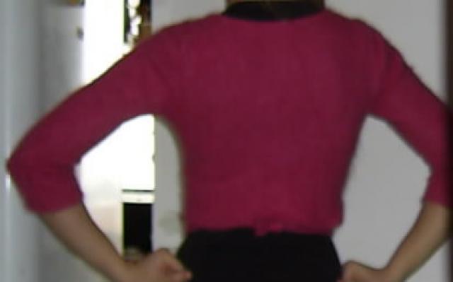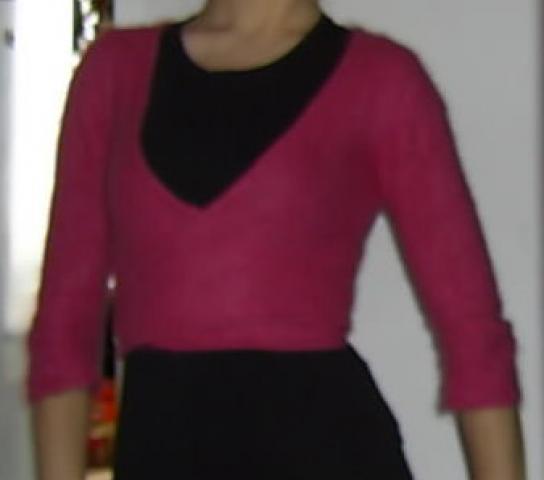 Trumpas, labai švelnus megztukas. Susiaučiamas raišteliais, kuriuos galima surišti priekyje arba, kaip matoma nuotraukoje, gale:)