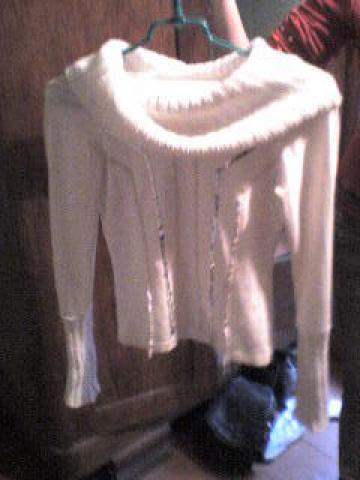 Baltos spalvos, megzta apykakle bei rankovėmis, su blizgučiais.