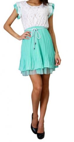 Nauja, su etiketėmis. Melsvai žalsva suknelė (mėtinė) tiks pasipuošti šiltą vasaros dieną. Suknelės viršutinė dalis nebalintos drobės spalvos su nėriniais, apatinė dalis klostuota, su pamušalu. Yra dirželis, kuris įsiveria per juosmenį. Galiu siųsti į kitus miestus + siuntimo išlaidos.