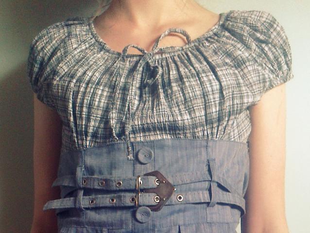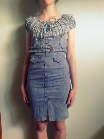 Melsva suknelė, apatinė dalis atrodo kaip džinsas, optiškai padidina krūtinę, nes daug raukinukų, labai graži, tinka ir 42 dydžiui.