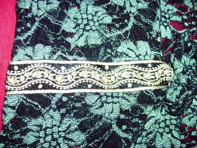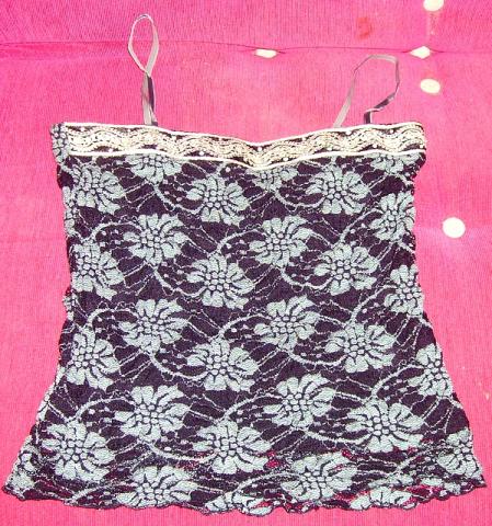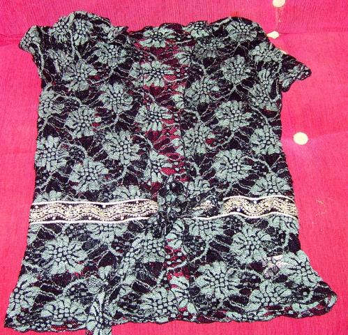 Pirktas Anglijoje ir daug kainavęs. Dviejų dalių, ažūrinis. Susideda iš palaidinukės su petnešėlėmis (su mėlynu pamušalu) ir surišamu bolero, ties pilvu juosta su blizgučiais. Pasakiškai dailus, bet man didelis.