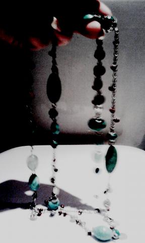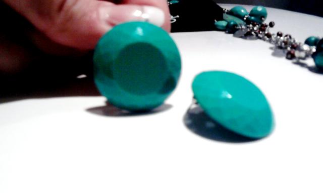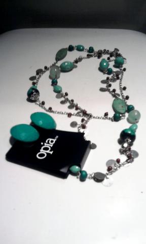 Mėlyna, ilga grandinėlė ir mėlyni auskariukai
