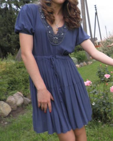 Nešiota vieną kartą, lengvos medžiagos, laisvai krentanti suknelė. Santūrios ir akį nerėžiančios spalvos mėlyna suknelė. Nėra jokių defektų.