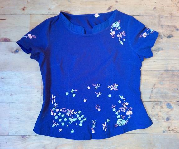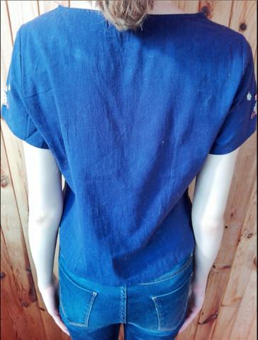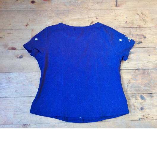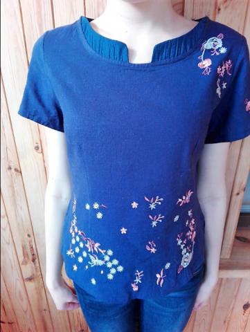 Nauja tamsiai mėlyna išsiuvinėta maikė. Išsiuvinėta gėlės ir paukštis. Ilgis 48 cm. Rankovės ilgis 15 cm. Medvilnė, poliesteris. Realybėje spalva tamsiai mėlyna (panaši į džinsinę).