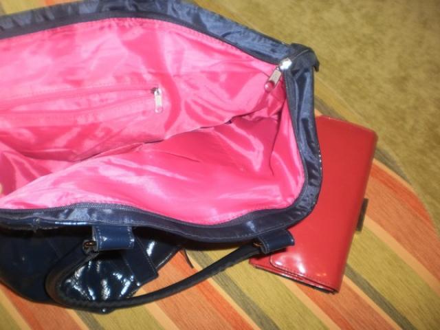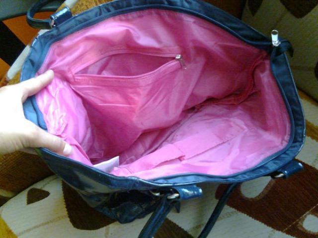 Mėlyna rankinė su rūžavu pamušalu viduje