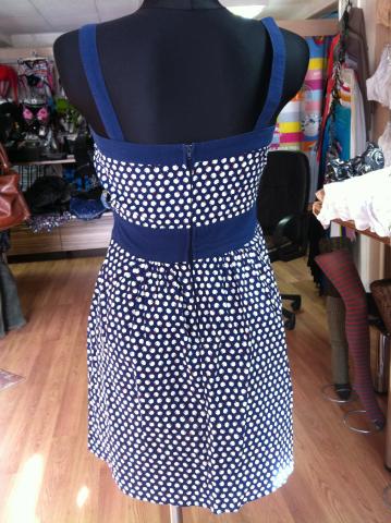 Mėlyna zaisminga suknelė, puošta baltais obuoliukais.Labai patogi ir grazi.