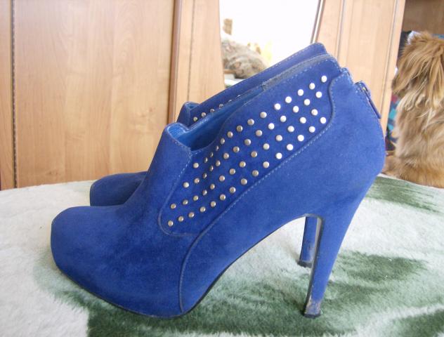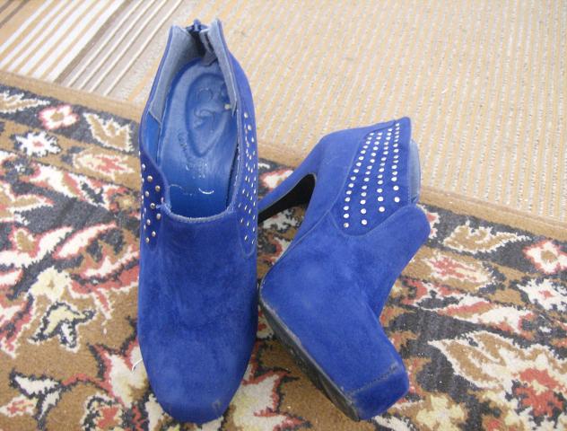 nuostabus aukstakulniai ,melyni su metaliniais taskeliais (ne vienas nenusilupes) ant platformos .Pirkau is nares ,tik man per aukstas kulnas ,truputi priekyje pukelis pasitrynes ir kulniukai nubraukti ,dydis tinka 41