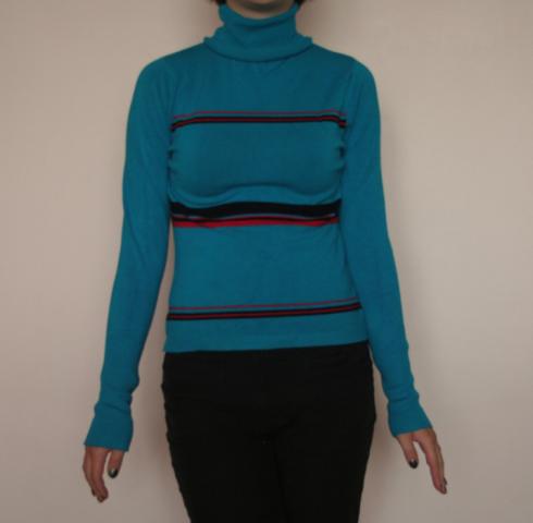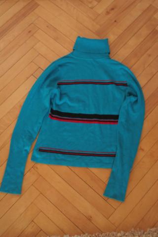 labai geros būklės mėlynas golfas su juodais ir raudonais dryželiais.