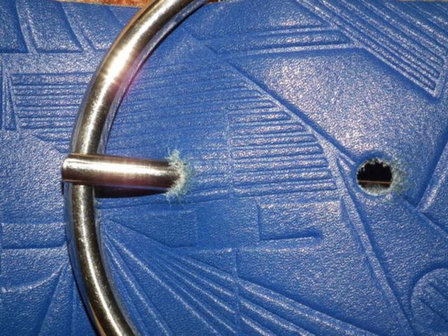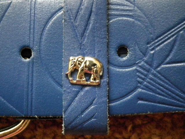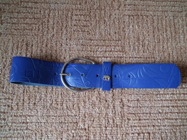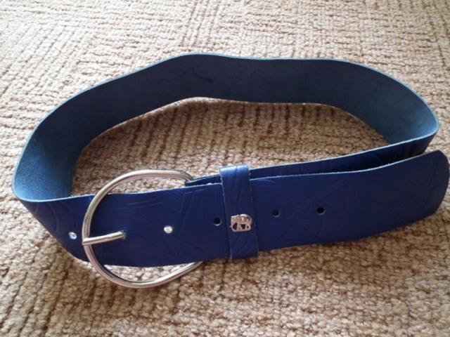 Mėlynos spalvos platus diržas. Odoje įspausti ornamentai. Plotis 58 mm. Ilgis apie 110 cm, nuotraukoje matosi kurios skylės buvo naudojamos