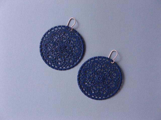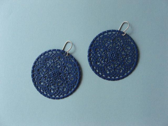 Metaliniai perforuoti auskariukai, mėlynos spalvos. Labai dailūs, skersmuo 4 cm.