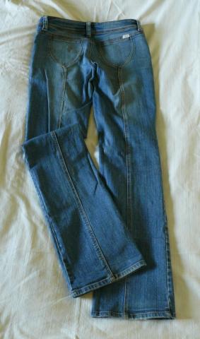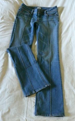Moteriški džinsai su kantu. Užpakalinėje dalyje - dvi kišenėlės. Platėjantys, be diržo. Be defektų.
