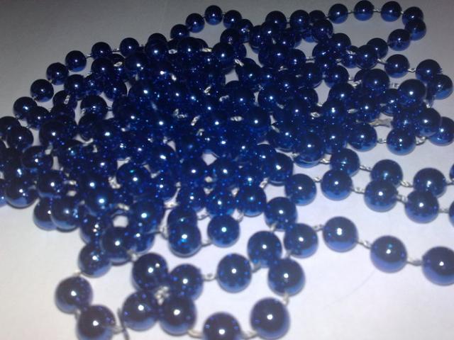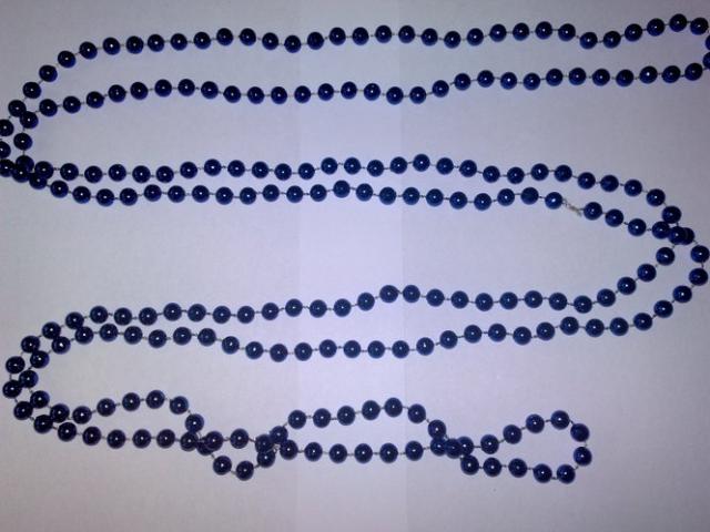 mėlyni ilgi blizgūs karoliai