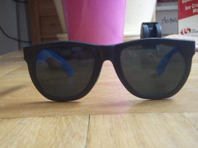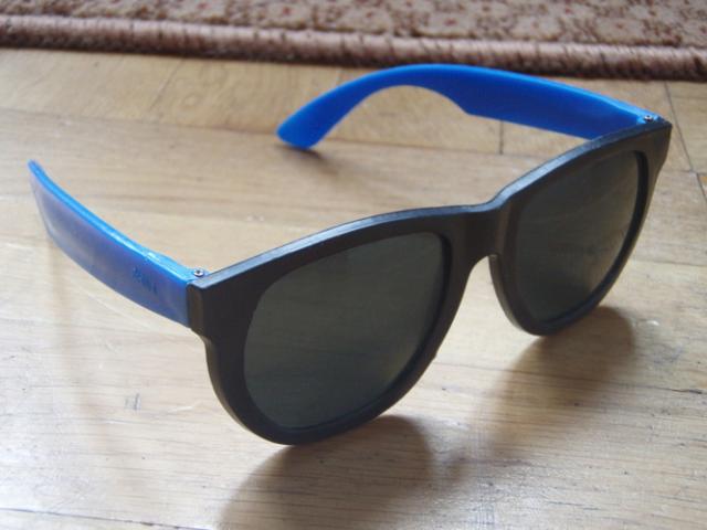 Juodi wayfarer akiniai mėlynomis kojelėmis.Stiklai ir rėmeliai plastikiniai