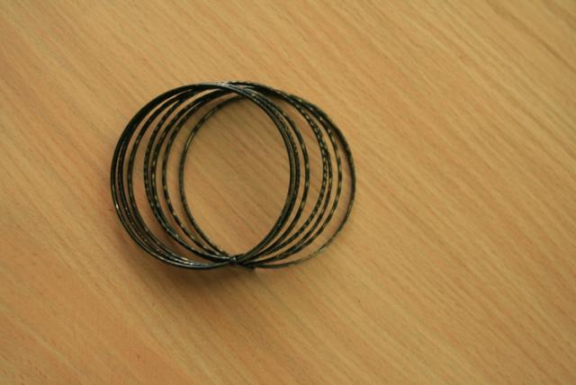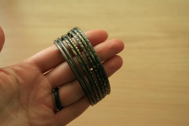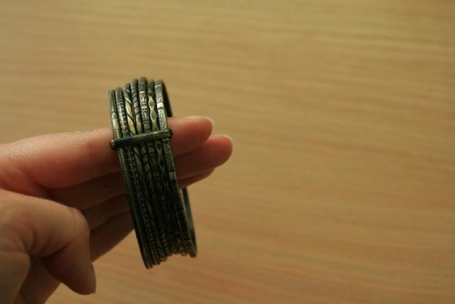 kokio jos metalo - nežinau. žinau tik tai, kad ši apyrankė veik nebuvo nešiota, nes tokio aksesuaro tiesiog nemėgstu. o šiaip tinka plonesnei rankutei.