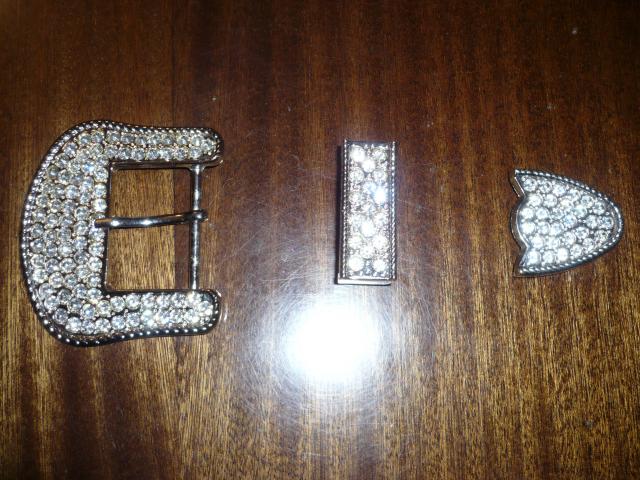 Metalinės diržo detalės iš akučių. Sagtis, diržo galiukas, lystelė (diržo galui perverti kad neatkartų). Yra visos akutės, ypač įspūdingai atrodo, spindi prie dirbtinio apšvietimo. Sagties plotis 6,5 cm, aukštis 7,5 cm