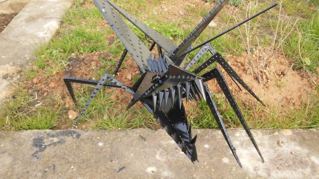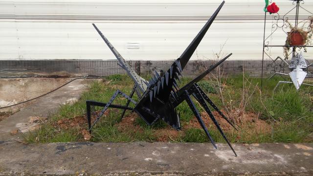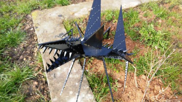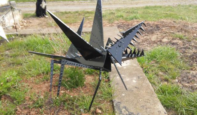 iš metalo pagamintas unikalus ir vienintelis fantastinis paukštis-plėšrūnas-tik dar be vardo.Tegul pakrikštyja naujasis šeimininkas :) išmatavimai- ilgis- 80cm, plotis 75cm, aukštis 67 m., svoris virš 20 kg.