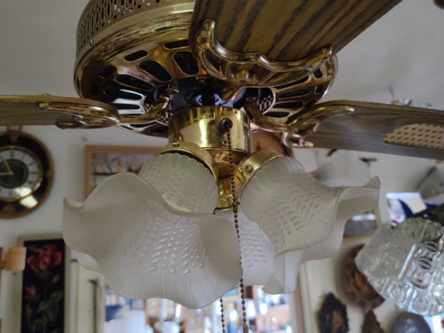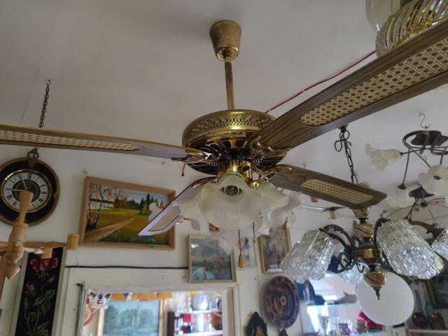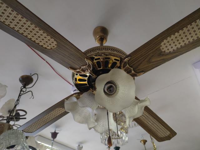 Lempų gaubtai stikliniai. Ventiliatoriaus sparniai mediniai. Viskas veikia. Skersmuo per sparnus 122 cm.