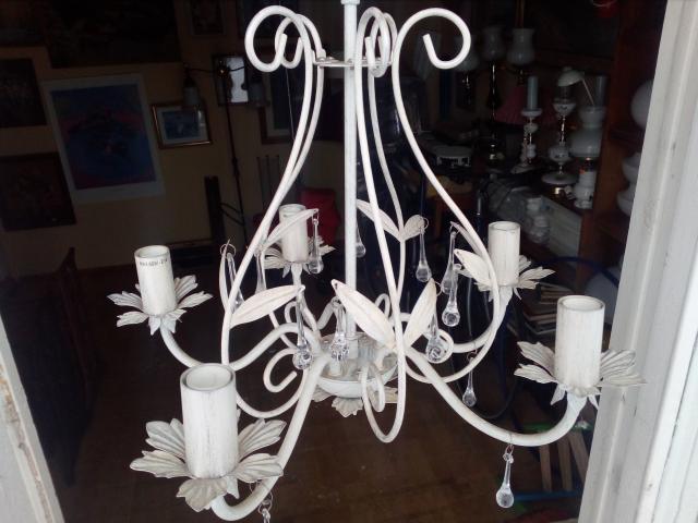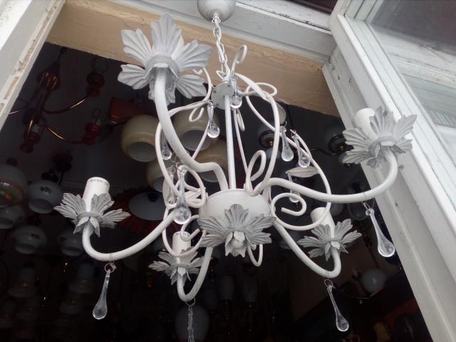 Metalinis penkių lempų šviestuvas su stikliniais varvekliais.