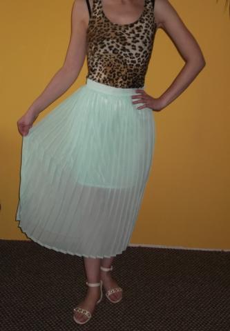 Vieną kartą dėvėtas mėtinis šifoninis sijonas, klostuotas, su pamušalu, pusiau permatomas. Būklė - kaip naujas, be defektų. Dydis xs/s.
