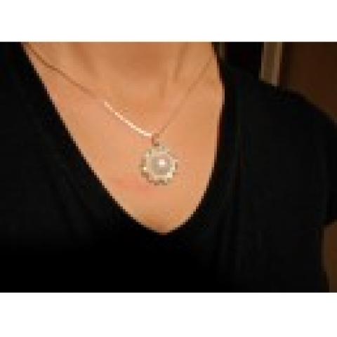 Papuošalų rinkinukas iš grandinėlės su saulytė ir tos pačios spalvos auskariukais lyg taškučiais. Yra mėlynos, baltos, rausvos, žalios spalvų.