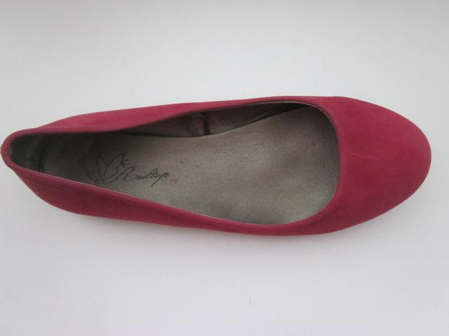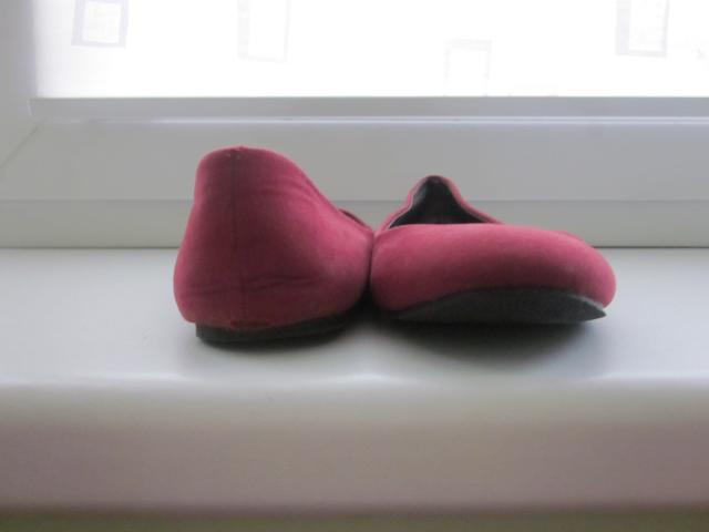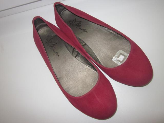 tamsiai raudonos spalvos balerinos. pirkau md, bet namie pasimatavus labai nuliūdau, nes jos man kiek per mažos. vienas batukas turi defektėlį-prie pado truputį nusitrynę, bet, kai vaikštai to nesimato. šiaip tikrai fainos ir stilingos. : ) kainą galima derinti.