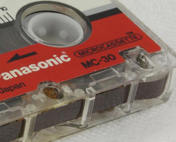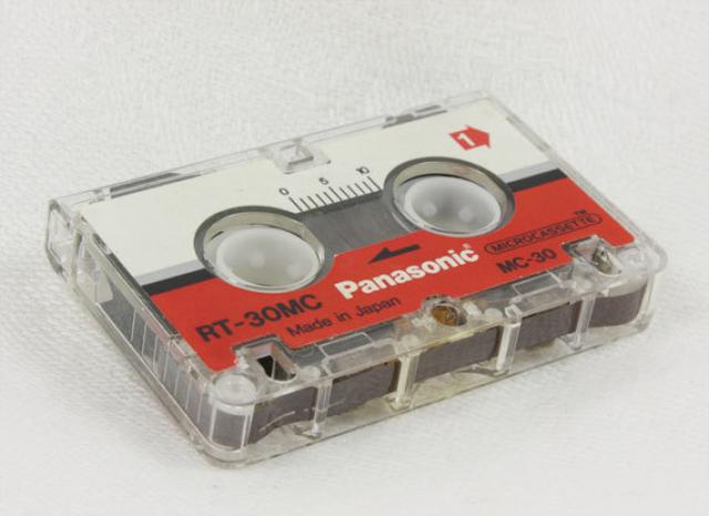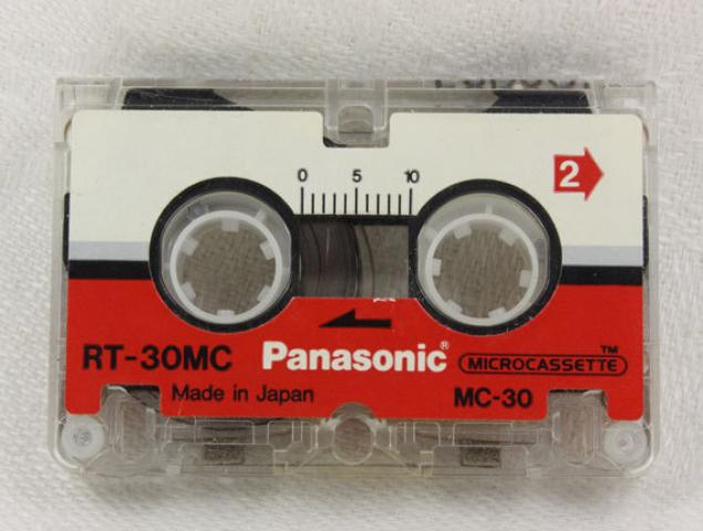 Microcassette Panasonic RT-30MC, 30 min., dvipusė, pagaminta Japonijoje, skirta kompaktiškiems analoginiams garso įrašymo įrenginiams- diktofonams, autoatsakikliams.