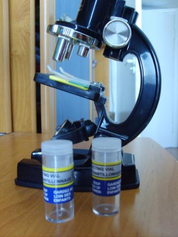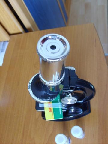 Plastmasinis mikroskopas, kuris didina x100, x200 ir x450. Yra 2 mažyčiai indeliai meginėliams ir jau padarytas meginėlis - musės spanas. Tik trūksta stikliukų, kuriuos kažkur išmėčiau. (ten foto musės sparno padidinant x100 su situo mikroskopu)