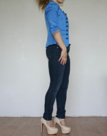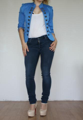 Švarkelis yra nešiotas, tačiau defektų nėra. Stengiausi tai parodyti nuotraukose. Militaristinio stiliaus detalės. 60% polisteris 32 % viskozė 8% elastanas Išmatavimai: Ilgos- 58cm; Rankovių ilgis- 47cm; Plotis- 37cm; Švarkelis yra elastingas (tamposi), kadangi sagutės yra kaip detalė (švarkelis nesusisega), tad švarkelis tinka daugeliui. : )