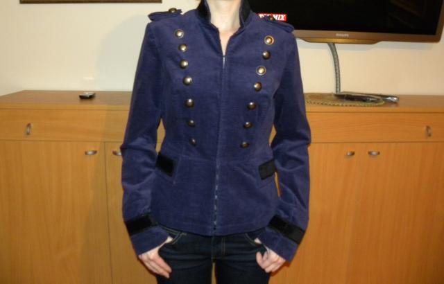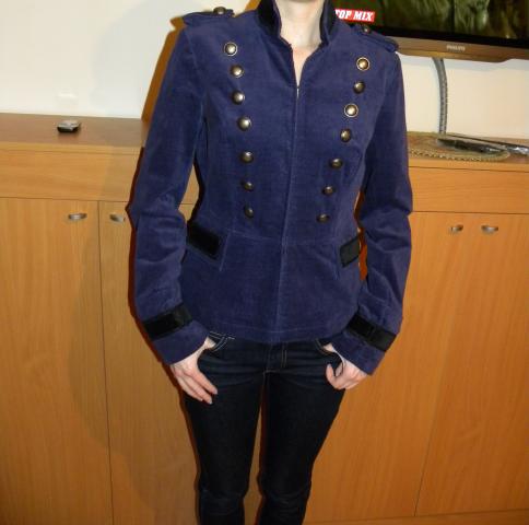 Dydis S, bet manau padidintas (nes man nešiojančiai S didokas), tad labiau tiks nešiojančioms S/M. Aksominė, švelni medžiaga. Švarkas gana šiltas, su pamušalu. Susisagsto kabliukais, rankogaliai bei kaklas puošti dekoratyvinėmis juostelėmis, eina dvi eilės dekoratyvinių, sendinto metalo sagų, yra dvi kišenės. Turi DEFEKTUKA - nedidele demele priekyje, virsuje. Bet gal issiskalbtu ar i chem. valyma butu galima nunesti. Spalva realiai gražesnė nei foto, ryškiai violetinė. Rankovių ilgis nuo pažasti