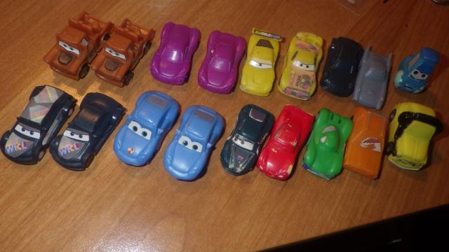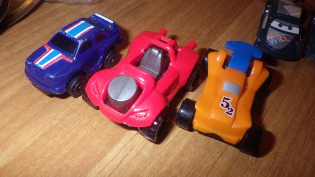 kinder, disney's cars, hasbro ir kt. dydis matosi. kai kurios metalines (die cast), nors ir visai mazos, ~2cm. + du sraigtasparniai - matchbox ir transformeris. vw golf cabrio nebera.