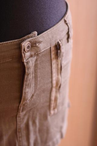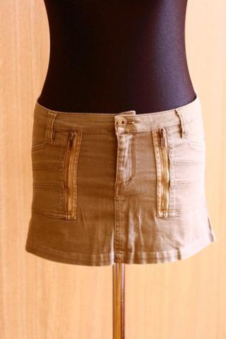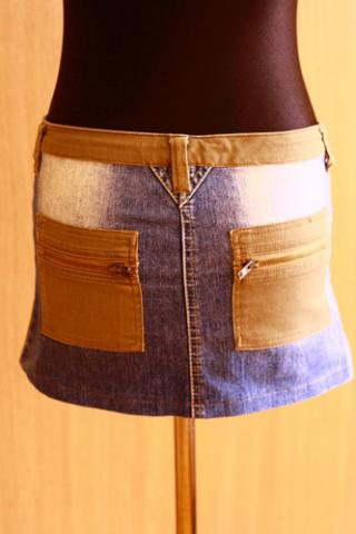 Dydis M, sijonas labai trumpas. Nugara persiūta, padaryta iš džinsinės medžiagos. Nugaroje kišenės uždėtinės, priekyje paslėpta dekoratyviniais užtrauktukais.