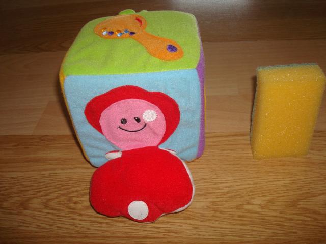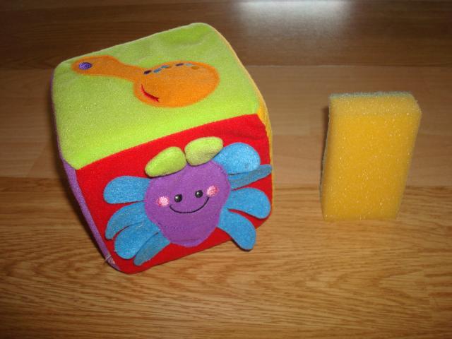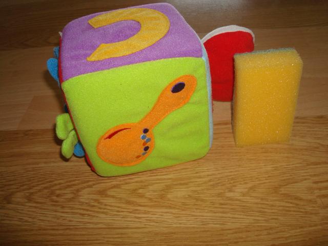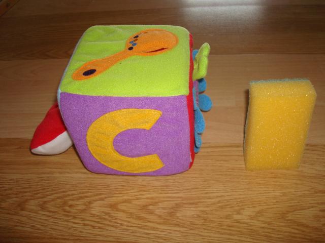 Minkstas kubikas. pridejau salia kempinele, kad butu matyti koks jo dydis