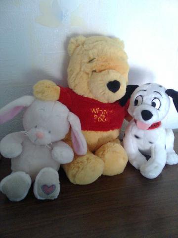 Minkšti pliušiniai žaislai- Mikė Pūkuotukas apie 30cm, dalmatinas 15cm ir triušelis 20cm. Labai geros būklės, nežaista su jais, tik stovėjo ant lentinos.