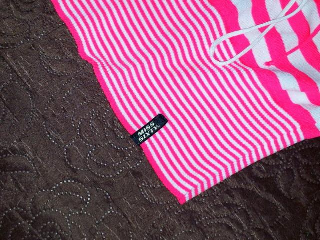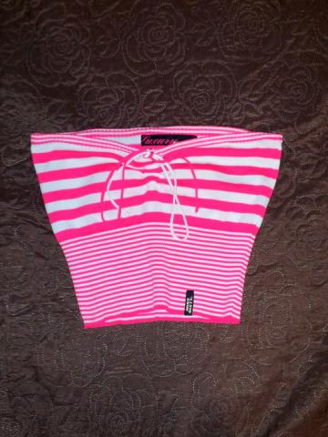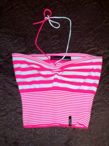 miss sixty orginali bliuskyte, galima deveti susirisus ties krutine ir susirisus per kakla, labai daili. labai tampri matmenys: visas ilgis: 27cm krutine: 32cm neistempus